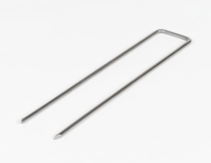 Stahlstifte in U-Form (40 cm lang) zur Befestigung des Kunstrasens an den Außenkanten. Die Empfehlung lautet: 1 Nadel pro 50 cm. Damit sichern Sie das Gras an den Außenkanten und verhindern ein Aufrollen.